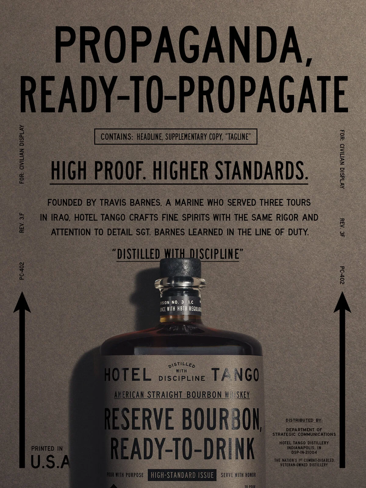 For this veteran-owned distillery, we wanted to create an identity that respected the founder’s military roots, while still remaining broadly appealing to discerning drinkers. The work takes inspiration from military MRE’s (Meals, Ready-To-Eat), using the same no-nonsense (yet precise and thorough) approach to look and language.